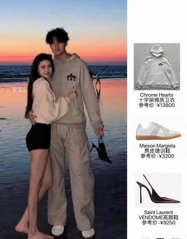 男生穿的灰色卫衣要13800元,鞋子也得3200元,小苹果的高跟鞋更贵,要9250元,俩人穿的都是大牌。 有传言说,男生家境不一般,和小苹果是“门当户对”。